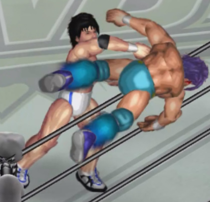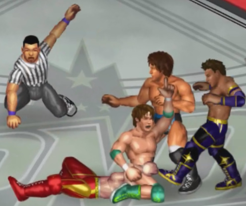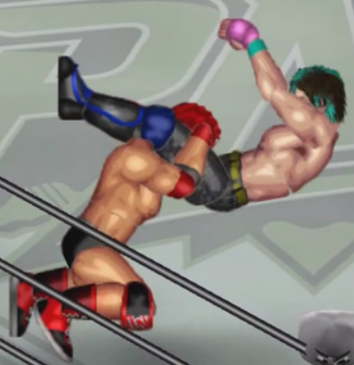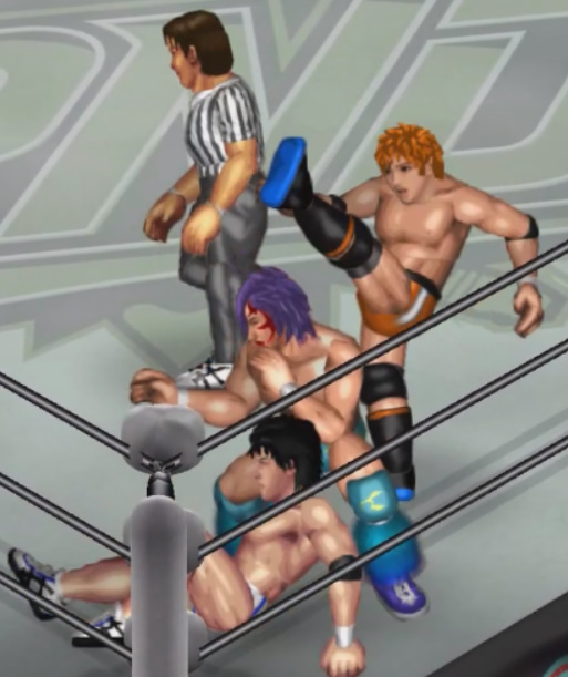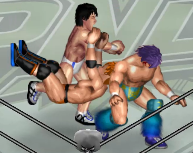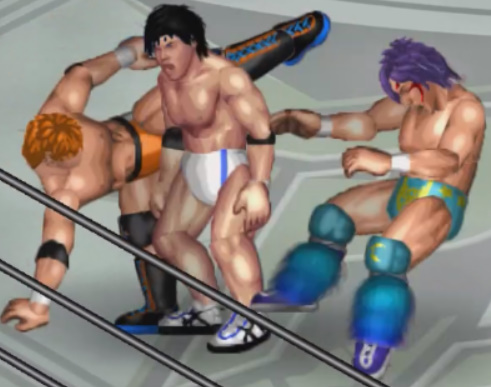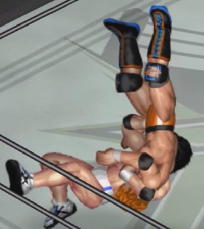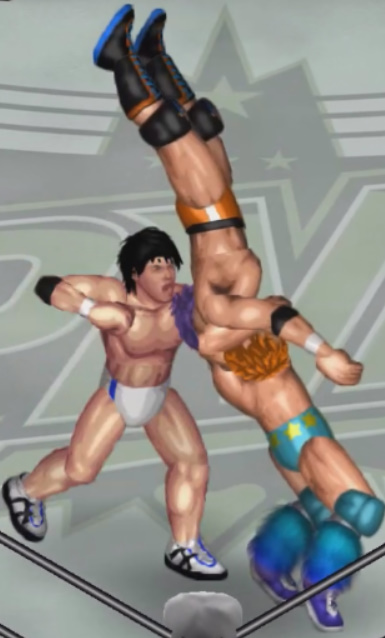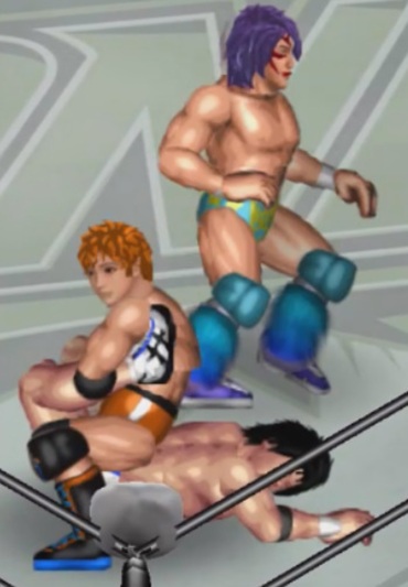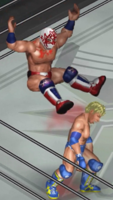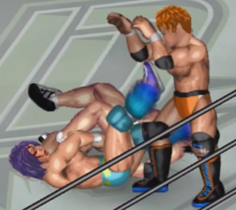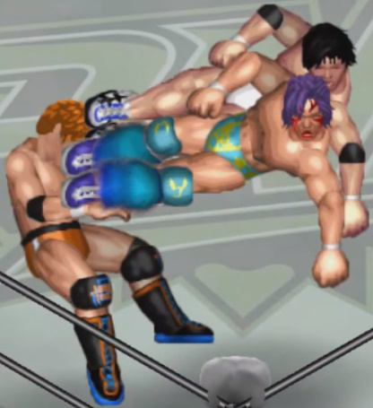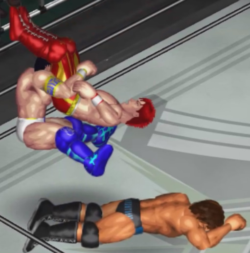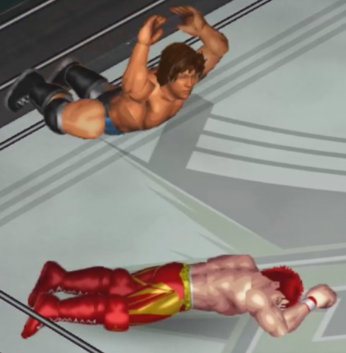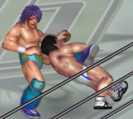 ホセが必殺技の捻り式ムーンサルトプレスを決めるが天神がロープを掴む。