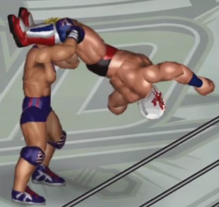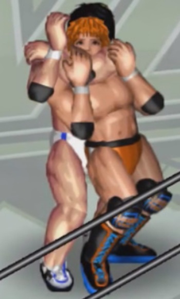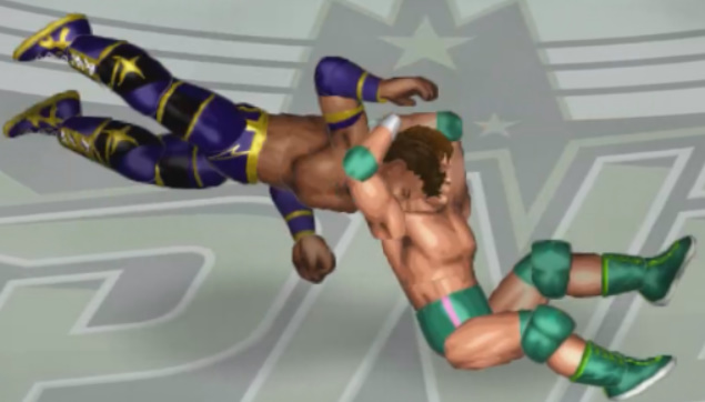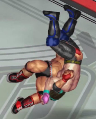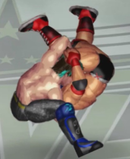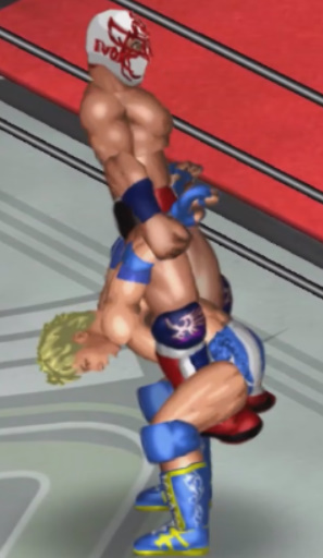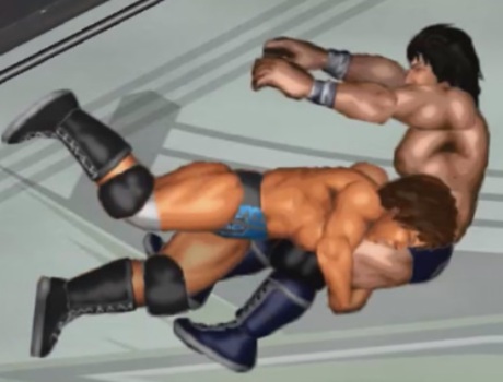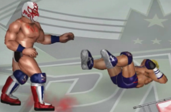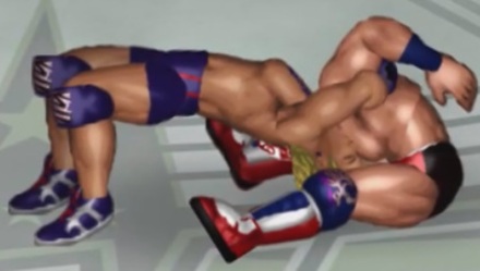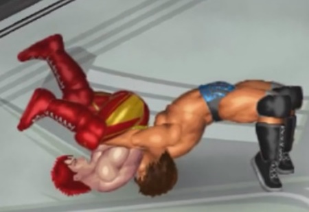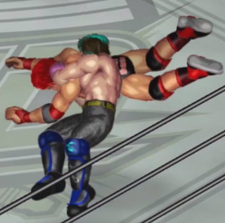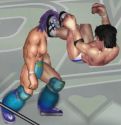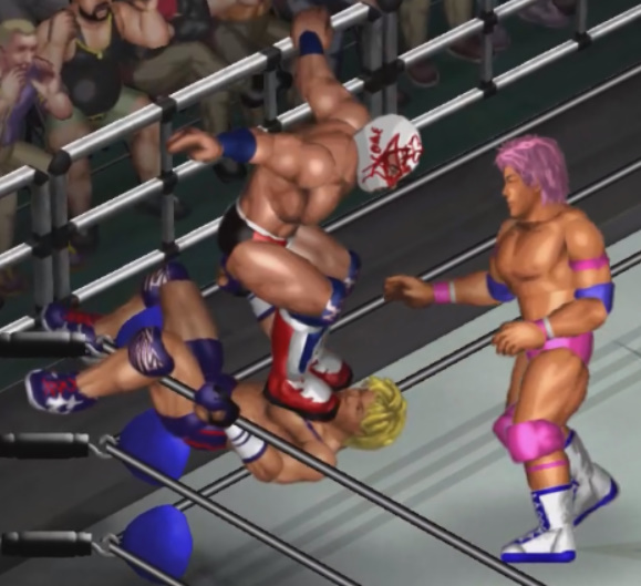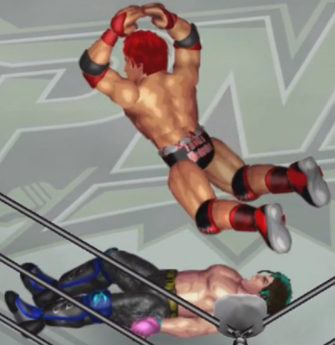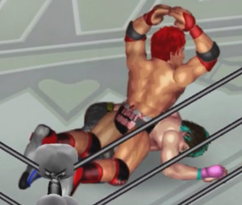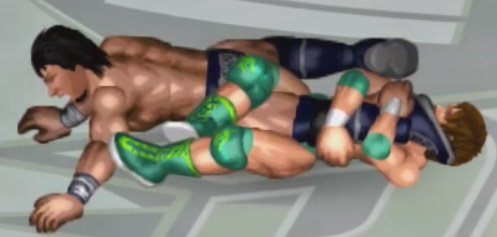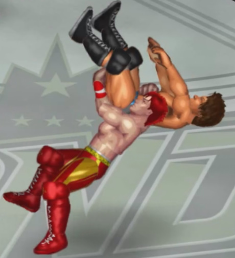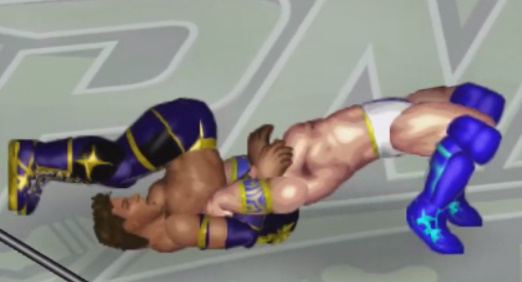 ホセが必殺技の捻り式ムーンサルトプレスを決めるが天神がロープを掴む。