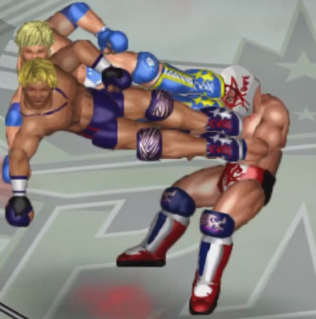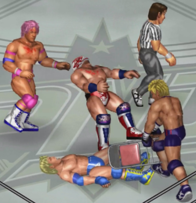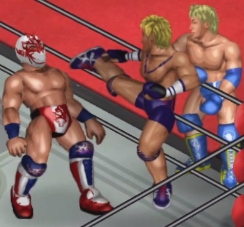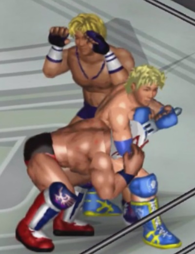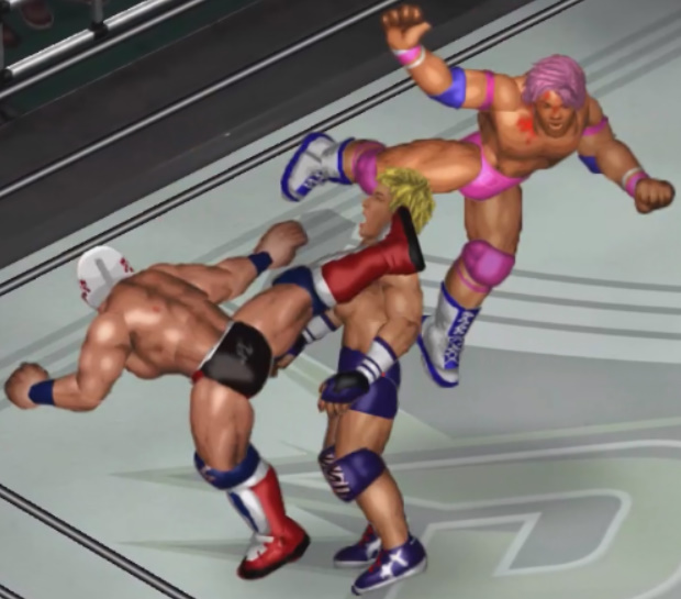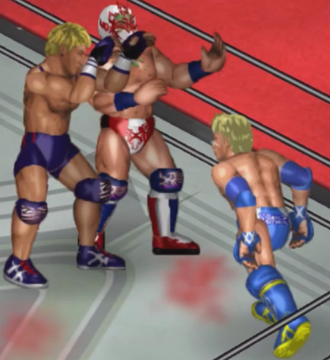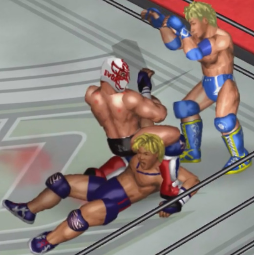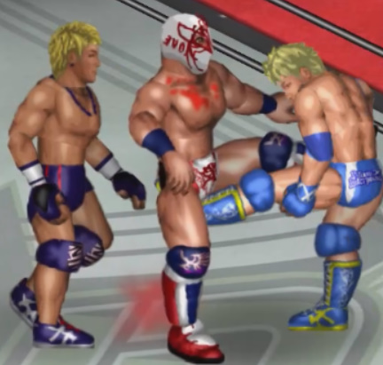 意外とコンビネーションが良い金髪タッグが共闘して2人まとめて叩き潰そうとしている。