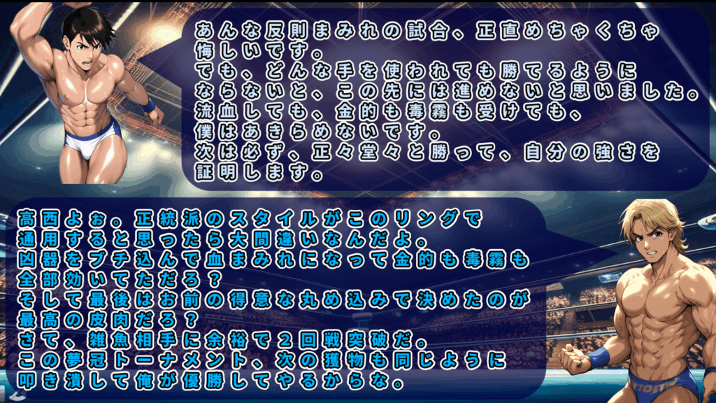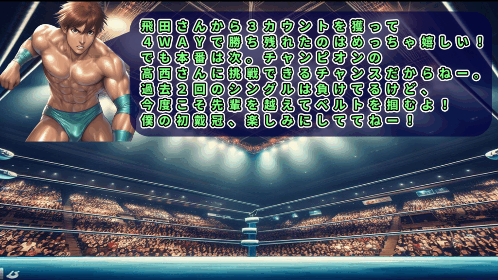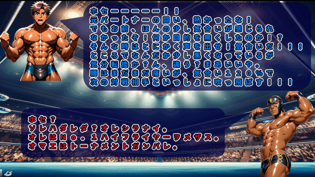 勝利した隼田が健闘を称えるコメントを出そうとするが、冒頭でいきなり「ホセ」と叫んでしまい、謎のマスクマンの正体がバレる。