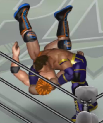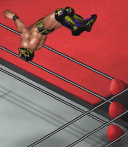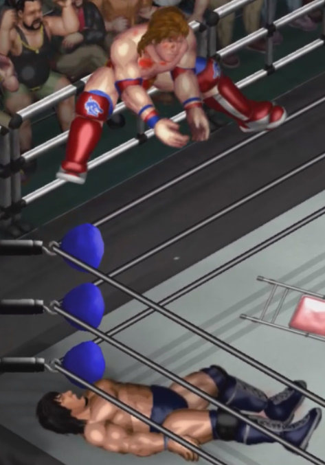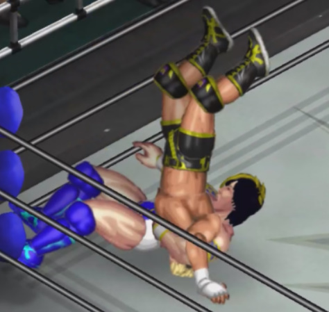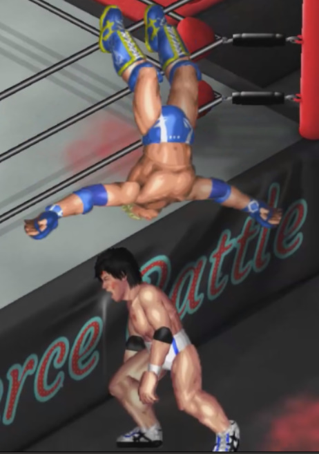チャンスとみた新井がコーナーに上がりダイビングボディプレスを投下するが桜塚が避けて自爆。全身を痛打。