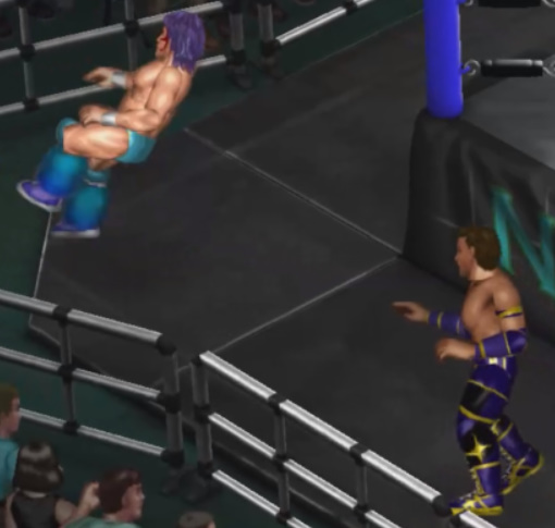 珍しくコーナーに上がったカイザーは西畑の腰にダイビングエルボードロップ。