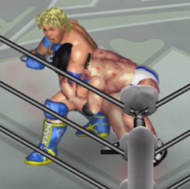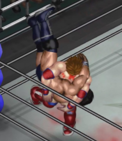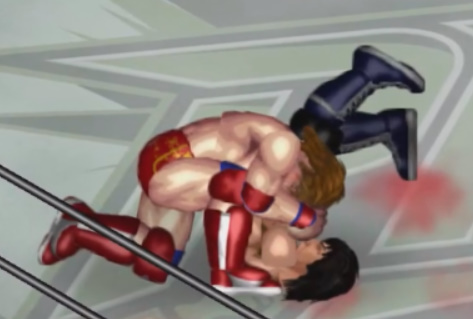 場外でもバッファロースリーパーで絞めあげて怒りをぶつけるが流れる血が場外マットを赤く染め、ファンの顔が曇る。