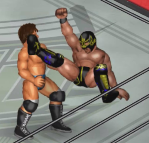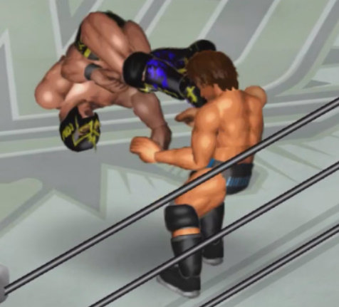 焦るフスマスクはキックの連発からコーナーの隼田にジャンピングエルボーを狙うが避けられてコーナーに激突。