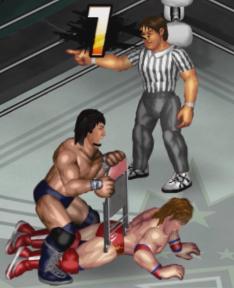 早速イス攻撃で腰を狙い、会場のブーイングなどどこ吹く風の動き。