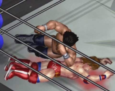 フスマスクの腰にエルボーを入れた隼田は元祖エビ反り式ダイビングボディプレスを背中に投下、腰攻めには腰攻めを返す。