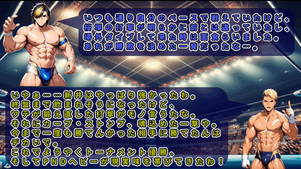 余裕の態度を崩さない新井が必殺技のエセックス・デストロイヤーを決めるが桜塚はフォールを許さず、さすがの新井も驚きの表情。