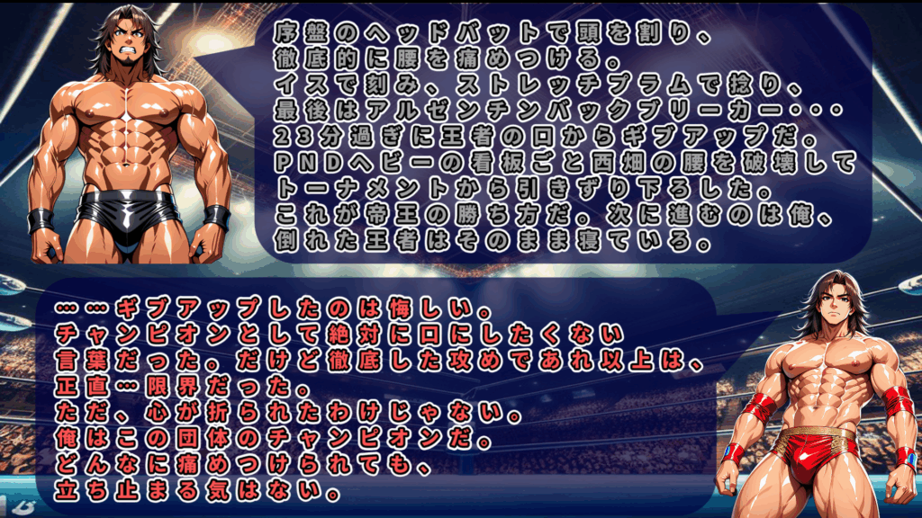執拗に西畑の腰を痛めつけるカイザーだが西畑はギブアップの文字を口にしない。