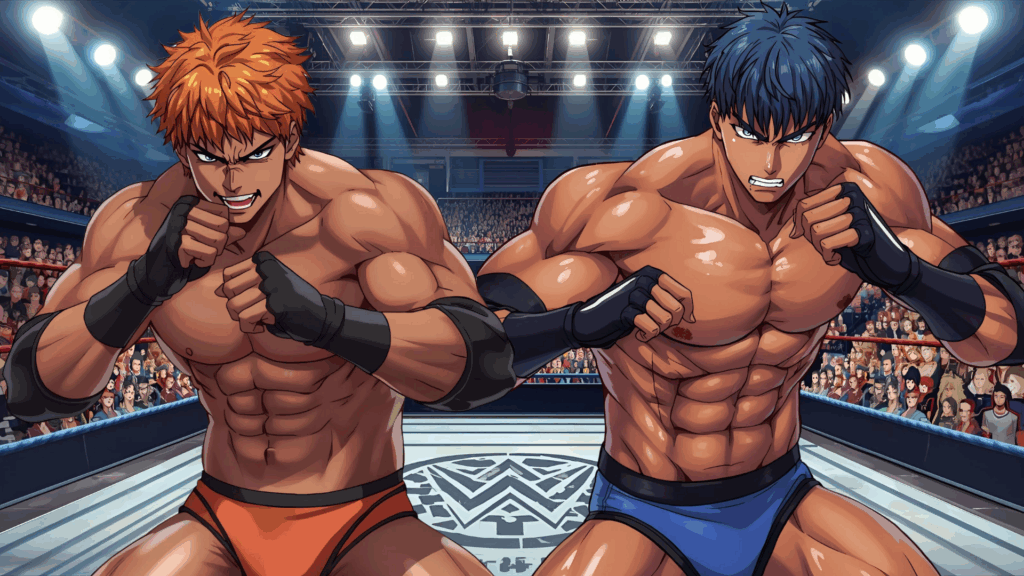 私ラフィがイラスト(AI生成)を、立板三様が小説を担当したコラボレーション連載企画で、アウトドアーズの海成がワタナベ・ワールド・エンターテインメント・プロダクション(WWEP)のユニットチーム・ブルーリヴァイアサン所属の郡 新選手と試合をする物語です。