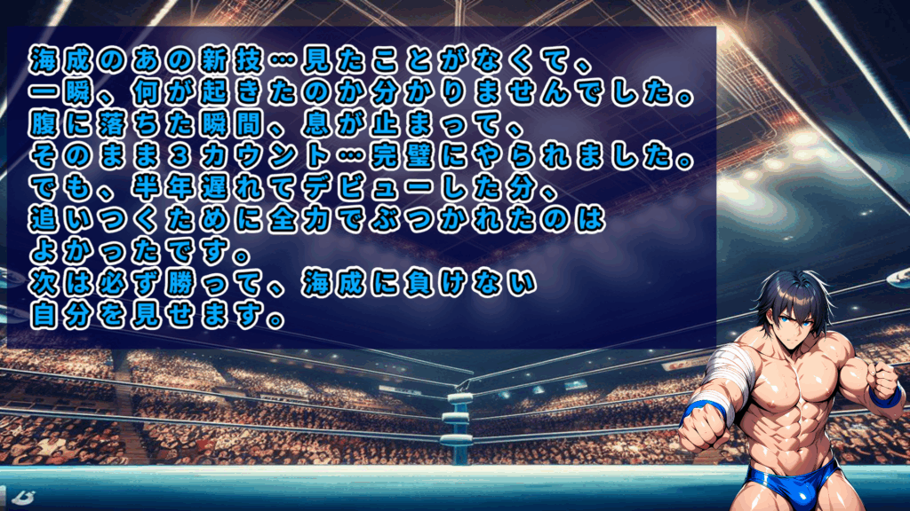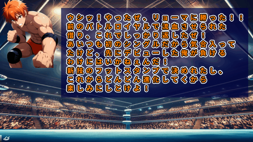 新技のダイビングフットスタンプでバトルロイヤルの借りを返した海成。