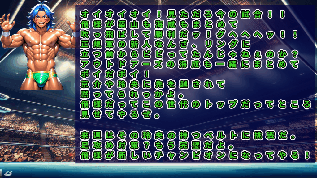 飛田が新人2人をポイッポイッ、チャンピオン北村へ挑戦状を叩き付ける