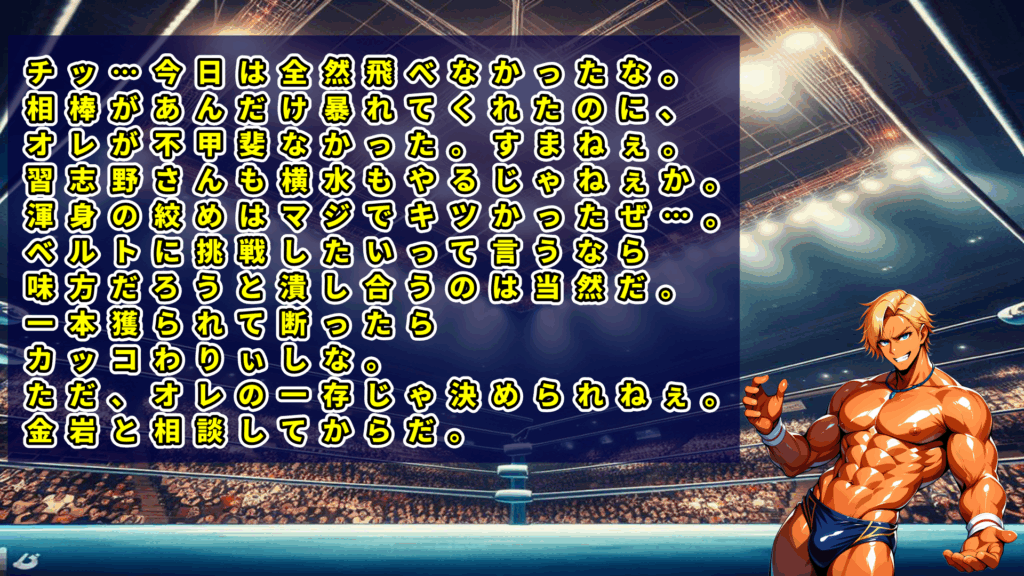 習志野がタッグベルト挑戦を打診するがチャンピオンの庄司は金岩と相談すると持ち帰った。