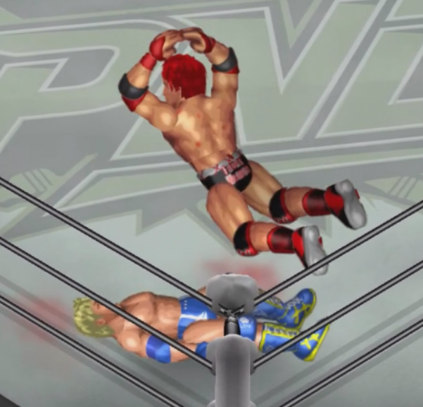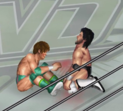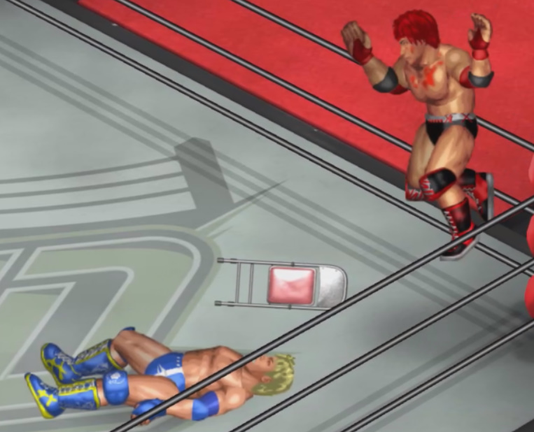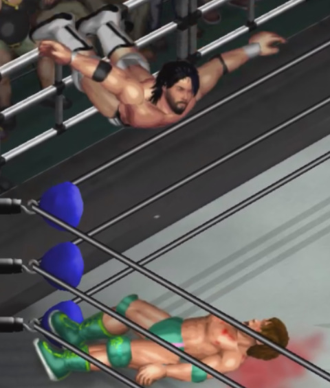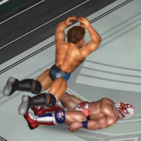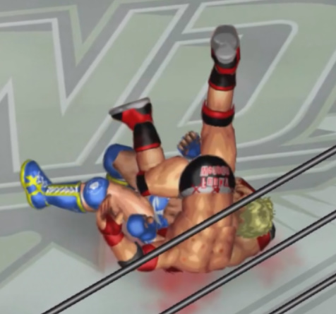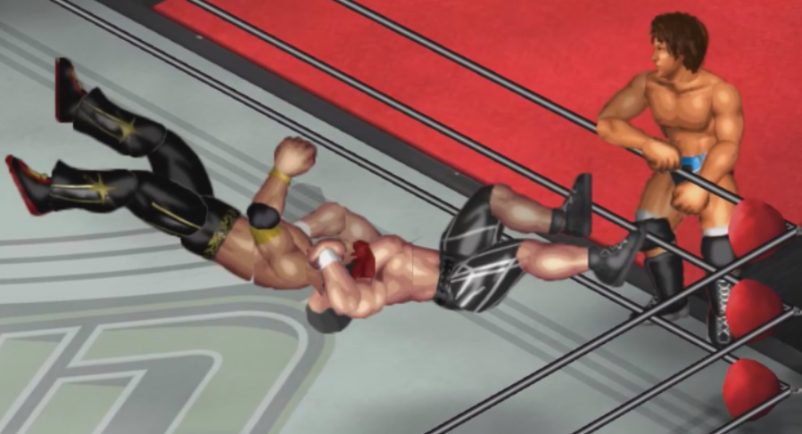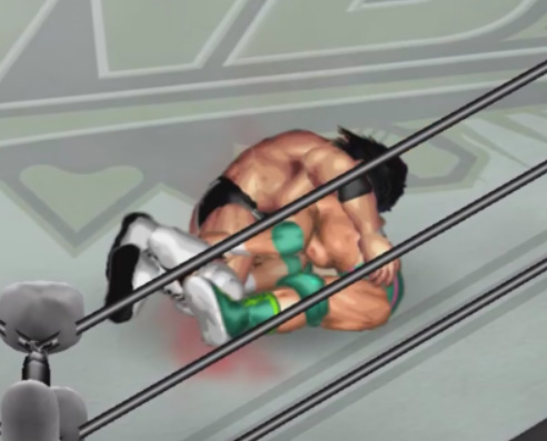 ならばと必殺技のジャンピングパワーボムを決めるがここでも天神はロープを掴む。