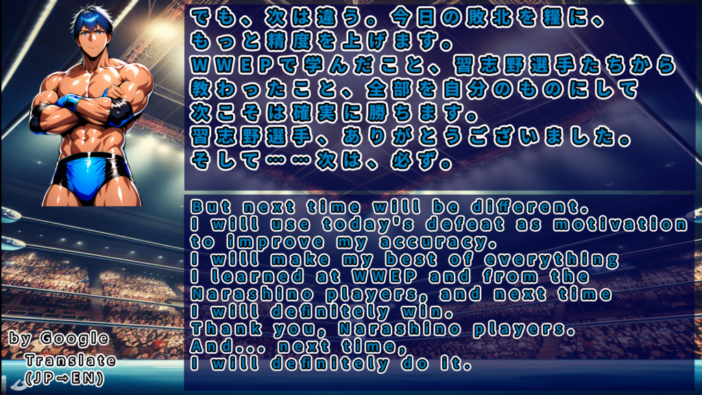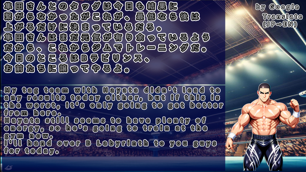 隼田と息が合わず今回も敗北してしまった本塚は改めてタッグの継続、連携の強化を誓う。