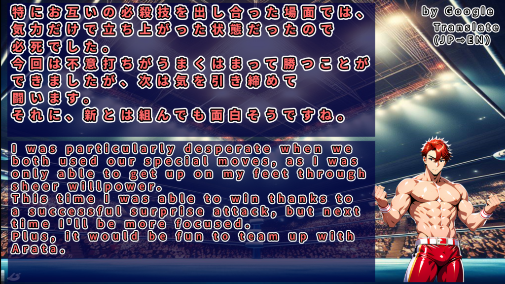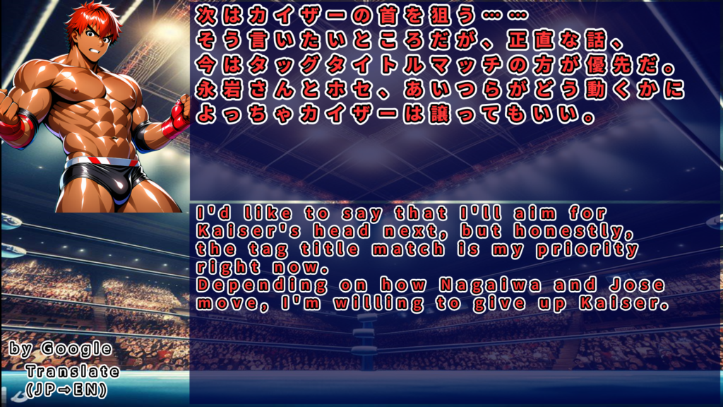 37分ものロングバトルを制したホセは遂に庄司・カイザー組への挑戦権を獲得したと宣言。