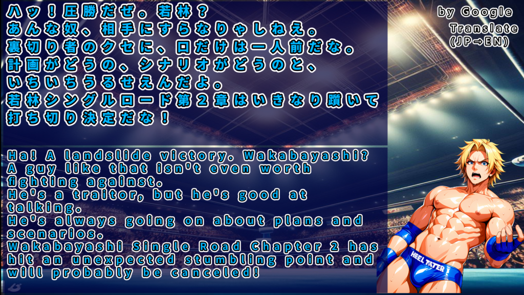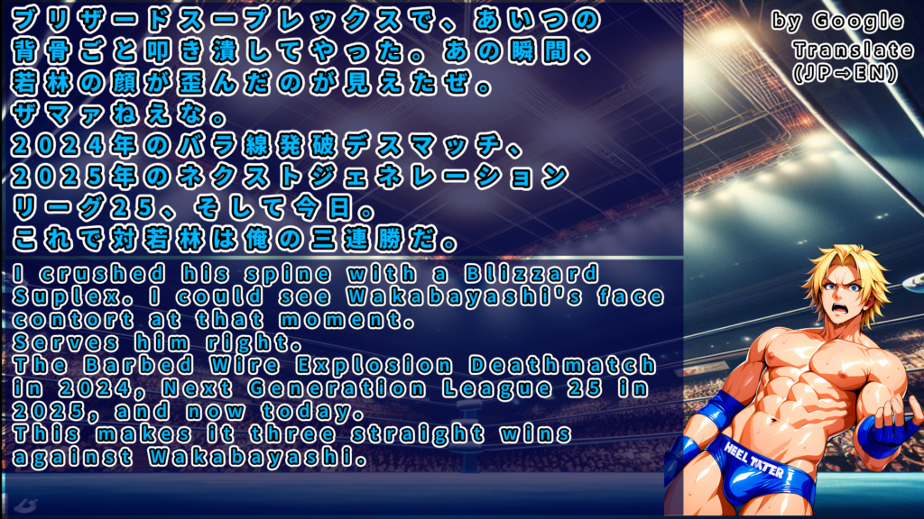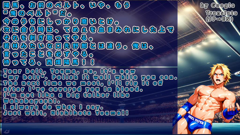 タッチを受けた本塚が高角度ジャーマンスープレックス、永岩を隼田が食い止めるがホセは自力でキックアウト、庄司への歪んだ想いが肩を上げる。