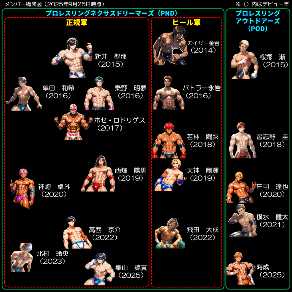 2025年3月、親団体がグループの刷新を兼ねて「アルカディア」の解散と代わる新団体「プロレスリングネクサスドリーマーズ」の設立を発表。